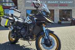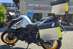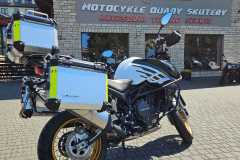 Oprócz standardowej nóżki bocznej, model SRT 900 SX ma na wyposażeniu również stopkę centralną. Dzięki temu parkowanie motocykla jest bezpieczniejsze, zwłaszcza podczas użytkowania założonymi kuframi lub